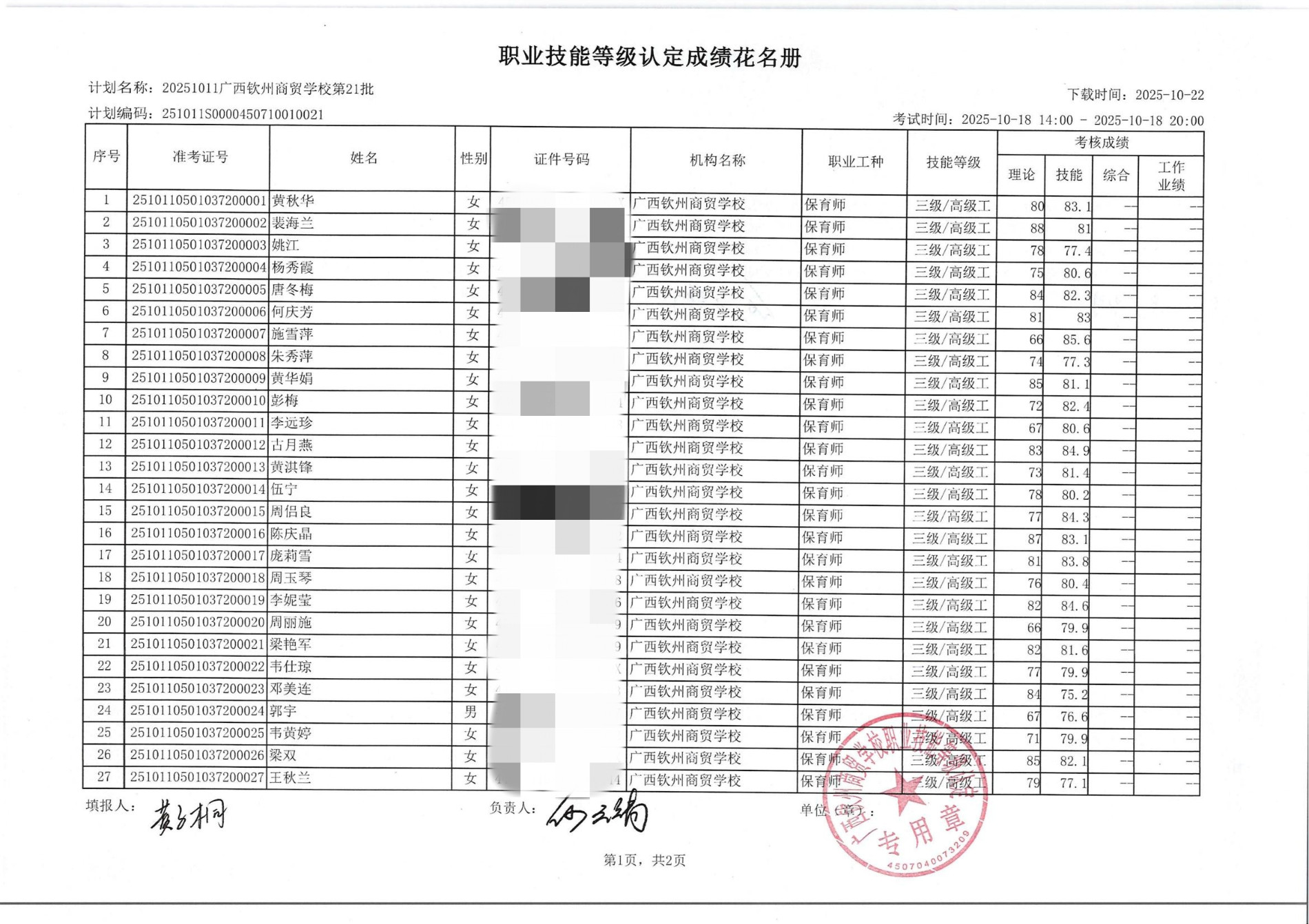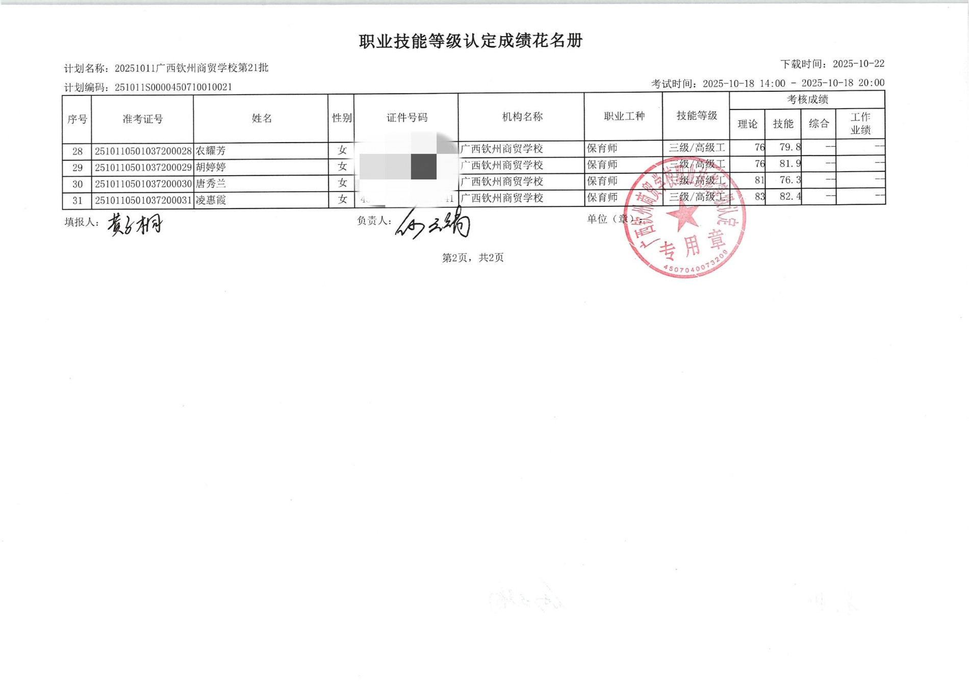 根据《广西壮族自治区人力资源和社会保障厅关于开展社会培训评价组织职业技能等级认定试点工作的通知》(桂人社函〔2020〕 203号)等有关文件要求,为确保职业技能等级认定的公平公正,广西钦州商贸学校职业技能等级认定试点机构于 年10月18日对钦州市钦南区人和职业技能培训学校的培训学员进行职业技能等级认定。现将黄秋华等31名考生成绩进行公示。