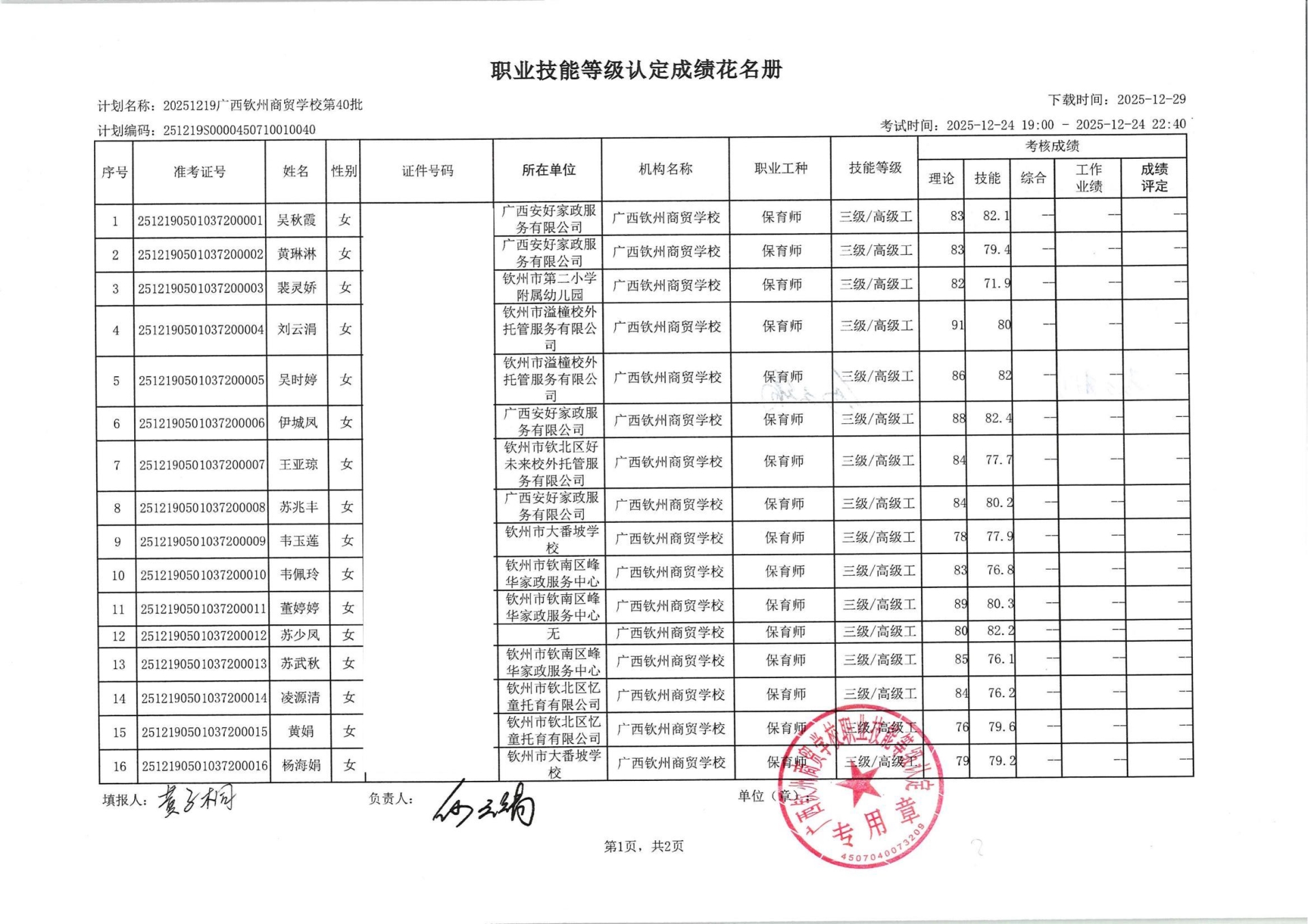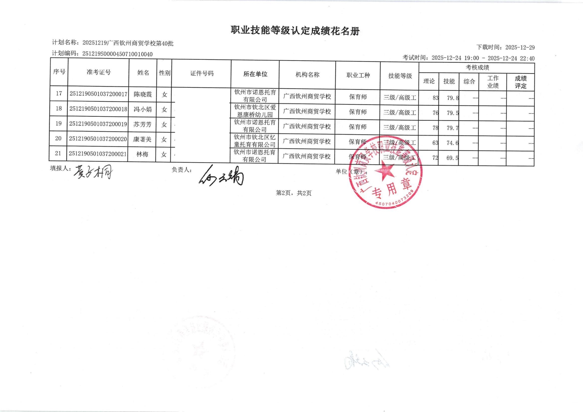 根据《广西壮族自治区人力资源和社会保障厅关于开展社会培训评价组织职业技能等级认定试点工作的通知》(桂人社函〔2020〕 203号)等有关文件要求,为确保职业技能等级认定的公平公正,广西钦州商贸学校职业技能等级认定试点机构于2025年12月24日对钦州市钦南区人和职业技能培训学校的培训学员进行职业技能等级认定。现将吴秋霞等21名考生成绩进行公示。