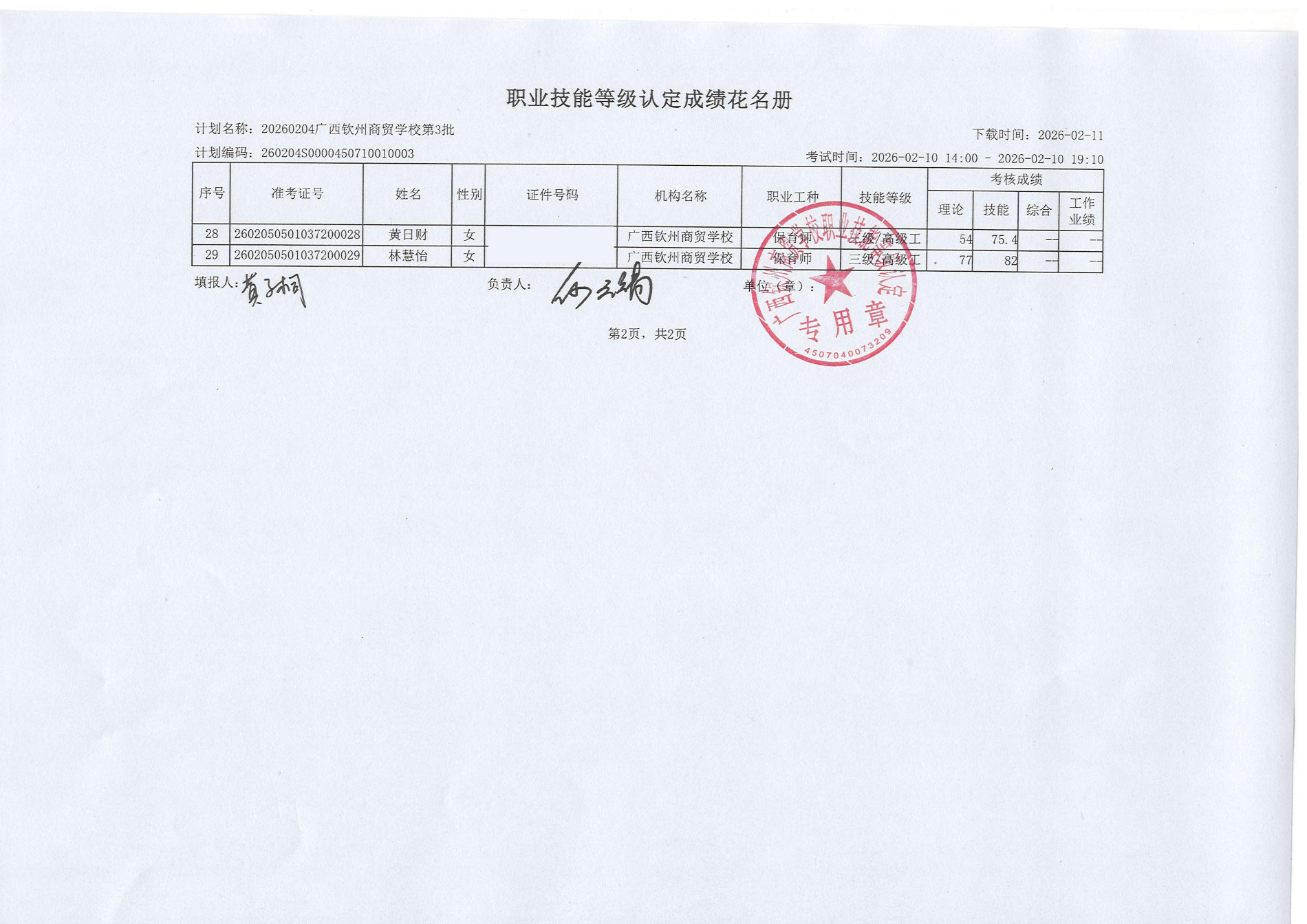 根据《广西壮族自治区人力资源和社会保障厅关于开展社会培训评价组织职业技能等级认定试点工作的通知》(桂人社函〔2020〕 203号)等有关文件要求,为确保职业技能等级认定的公平公正,广西钦州商贸学校职业技能等级认定试点机构于2026年2月10日对钦州市钦南区人和职业技能培训学校的培训学员进行职业技能等级认定。现将周艳华等29名考生成绩进行公示。